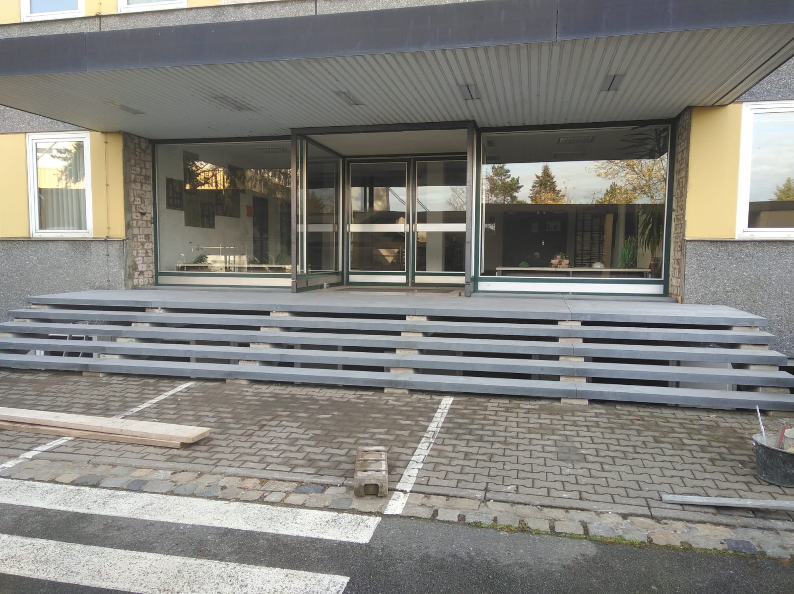 Massive Außentreppe aus Granit mit gelben Sandsteinquadern