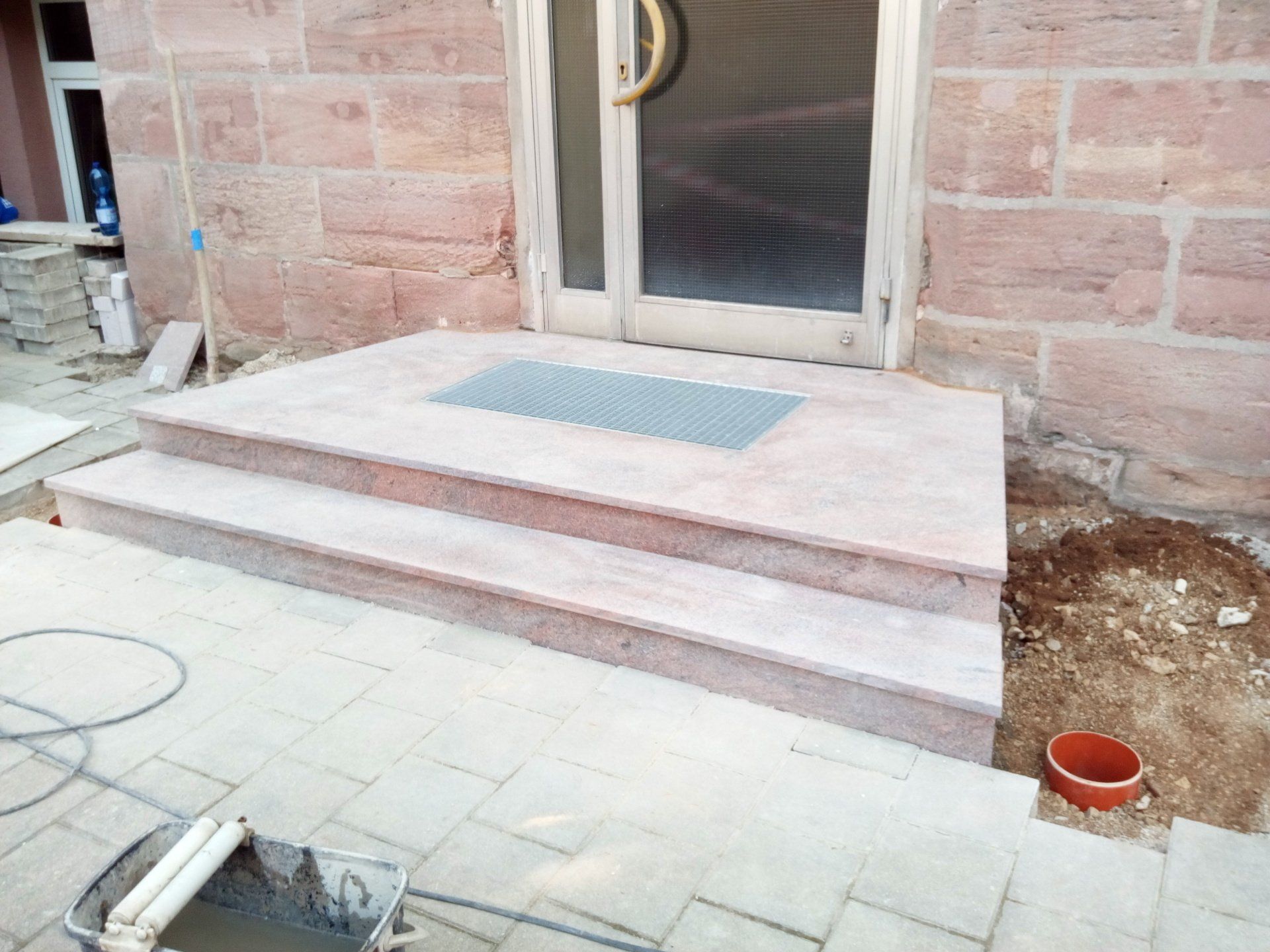 Massive Außentreppe aus Granit mit roten Sandsteinquadern